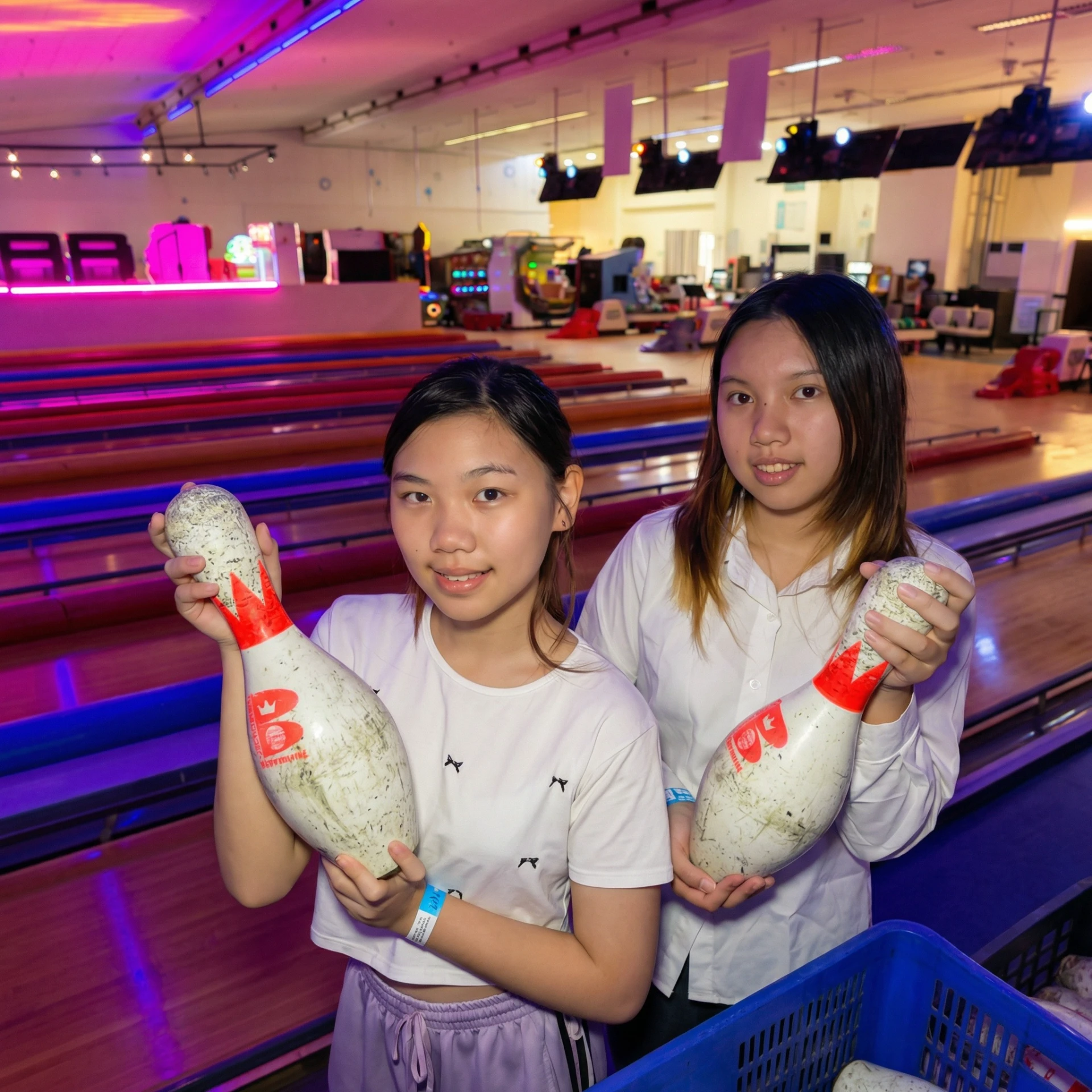 最棒的是他們的「親子保齡球道」!兩邊有護欄,球永遠不會洗溝(洗溝真的是小孩信心殺手啊😅)。亞米和安娜隨便丟都能撞倒瓶子,成就感滿滿,玩得超嗨!